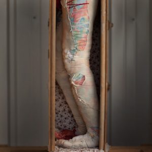 Meira Grossinger’s exhibit “Human Cell” is a site specific installation built from wooden cargo boxes. These boxes enclose figures that are made from used materials – human detritus like remnants of clothes, old newspaper, broken furniture, iron net and more, skillfully forming half naked, sensual body parts. This process of sewing and knitting, connects together the different elements, that are recycled into objects conveying feelings and ideas.